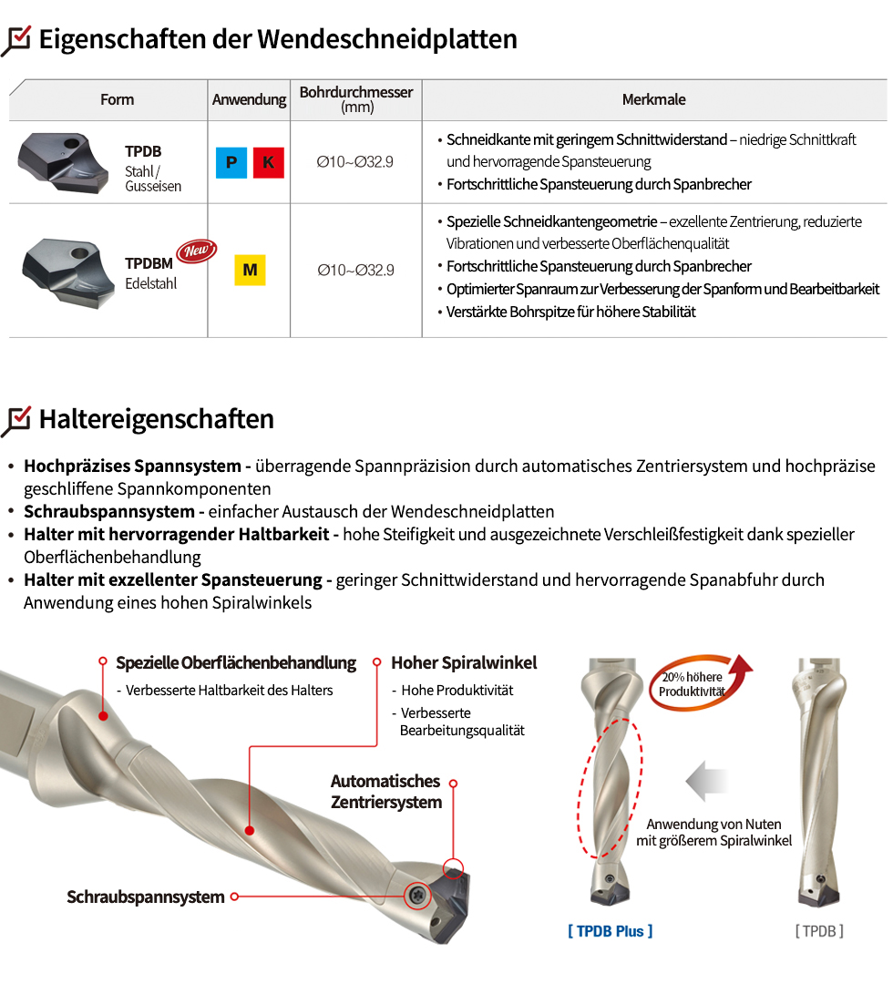 Um diesen Marktanforderungen gerecht zu werden, hat KORLOY den TPDB Plus Drill entwickelt – einen hochwertigen, hocheffizienten Wendeschneidplattenbohrer, der die Bearbeitungsqualität und Produktionseffizienz verbessert.