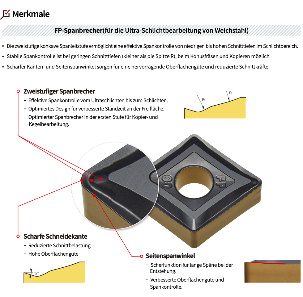 Der FP-Spanbrecher verfügt über eine zweistufige Spanbrecherform, die eine effektive Spanabnahme von Ultraschlichten (ca. 0,3 mm) bis Schlichten (ca. 1 mm) ermöglicht. Die für Kopier- und Kegelbearbeitung optimierte Spanbrecherform der ersten Stufe sorgt für eine stabile Spankontrolle beim Schlichten komplexer Formen.