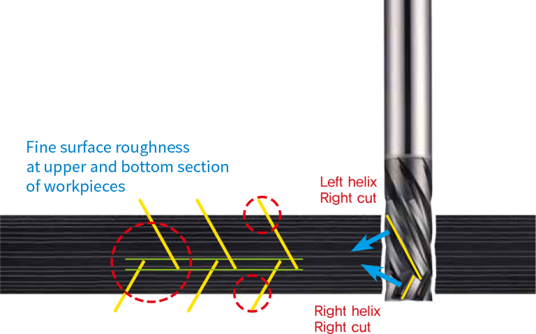 Cutting force is generated towards to middle of workpiece so it minimizes burr at upper and bottom section of workpieces. Upon the direction of a cutting edge, the upper edge cuts the workpiece to downwards, and the bottom edge cuts the workpiece to upwards.