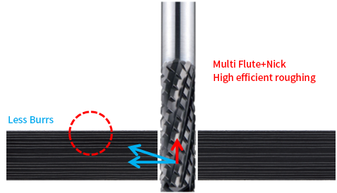 With implementation of Multi Flute & Nick design to improve its edge strength and it ensures high efficient roughing. Applied low helix angle also helps to prevent burr at the upper section of workpieces.