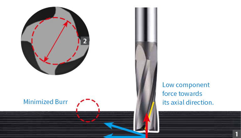 1. Minimizes cutting force towards axial direction with low helix angle to prevent burr generateing, but maximizes its cutting force towards its cutting direction. 2. Thick core web shape enhances a tool's strength and minimizes vibration.