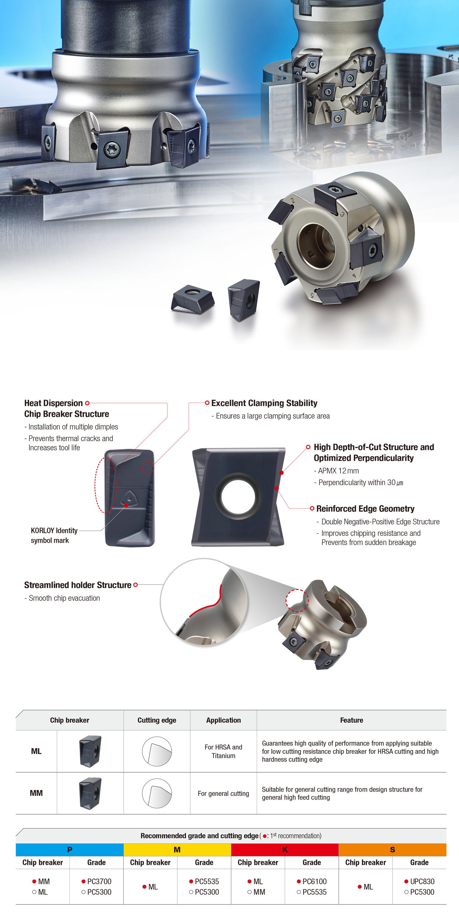 In addition, the combination with KORLOY's various specialized grades makes it applicable not only to steel and cast iron but also to various workpieces such as stainless steel and titanium alloys. It demonstrates outstanding performance, especially in roughing.