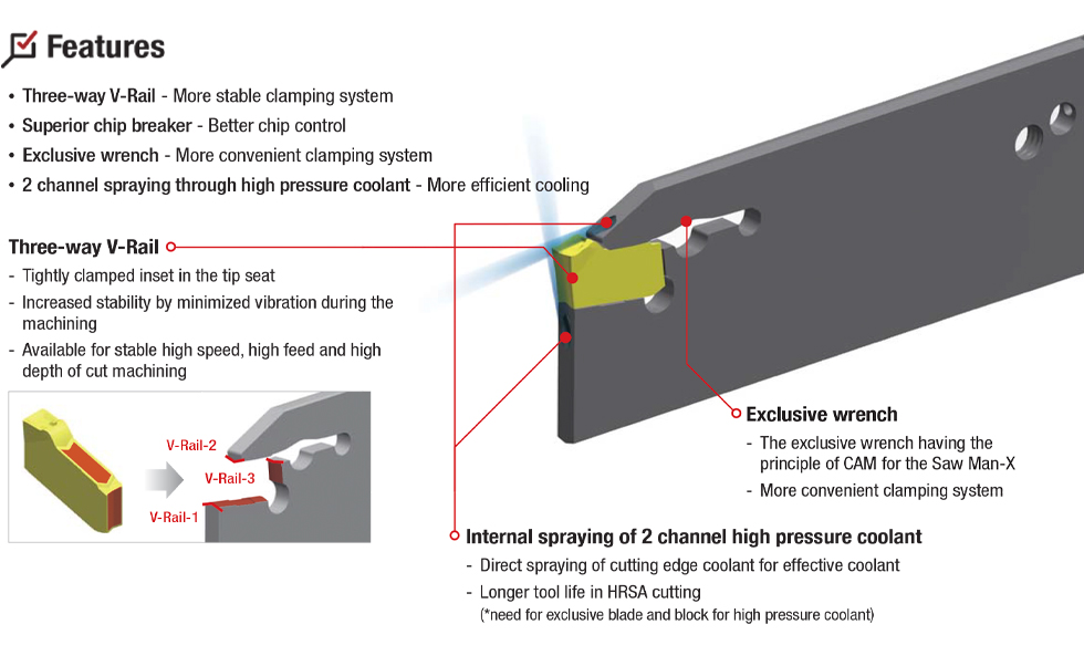 Saw Man-X holder has strong clamping structure due to three-way convex V-Rail ensuring perfect clamping insert in the seat of holder. Therefore, it realizes stable clamping in high speed and high feed cutting. Especially blade and block with high pressure internal spraying can maximize cooling efficiency when machining HRSA.
