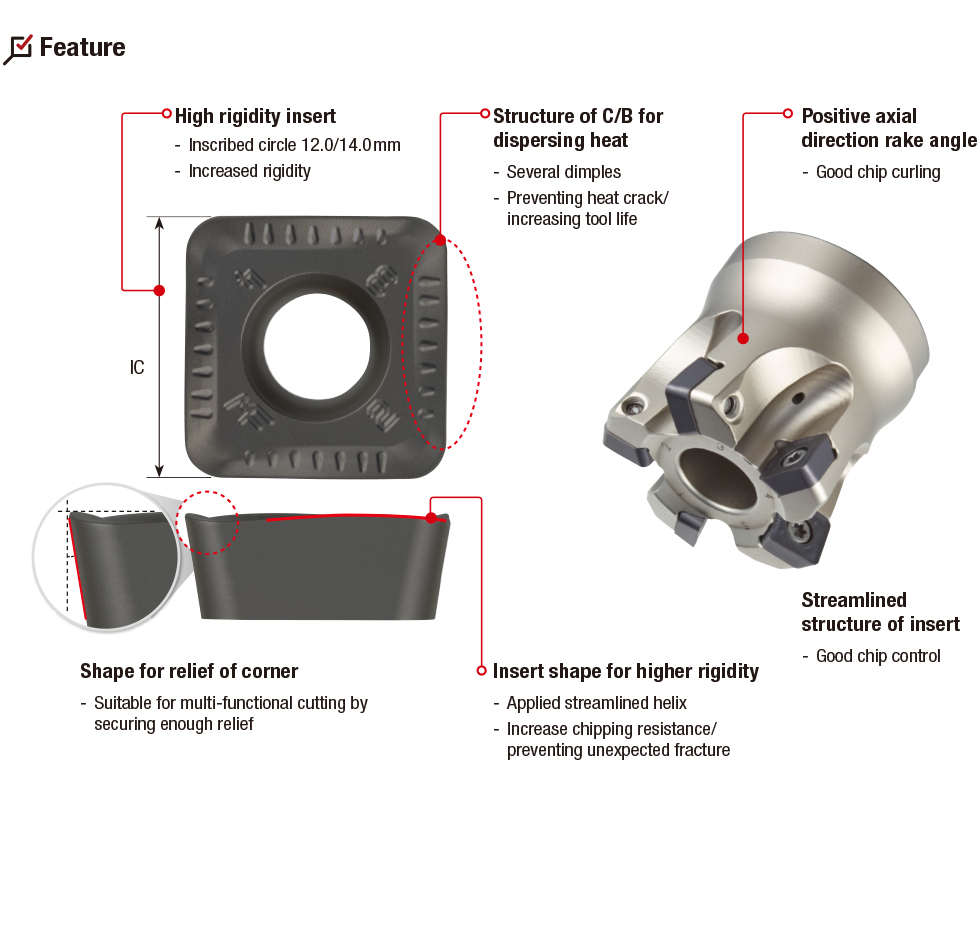 chip breaker design enable efficient chip management, protecting both the insert and the workpiece from damage, thereby extends tool life and ensures a clean surface finish. Additionally, the increased insert thickness and the application of large screws in the high-rigidity clamping system, along with a dimpled surface structure that effectively controls heat generated during machining, allow for over a 20% increase in feed rate compared to conventional high-feed machining, enhancing productivity.