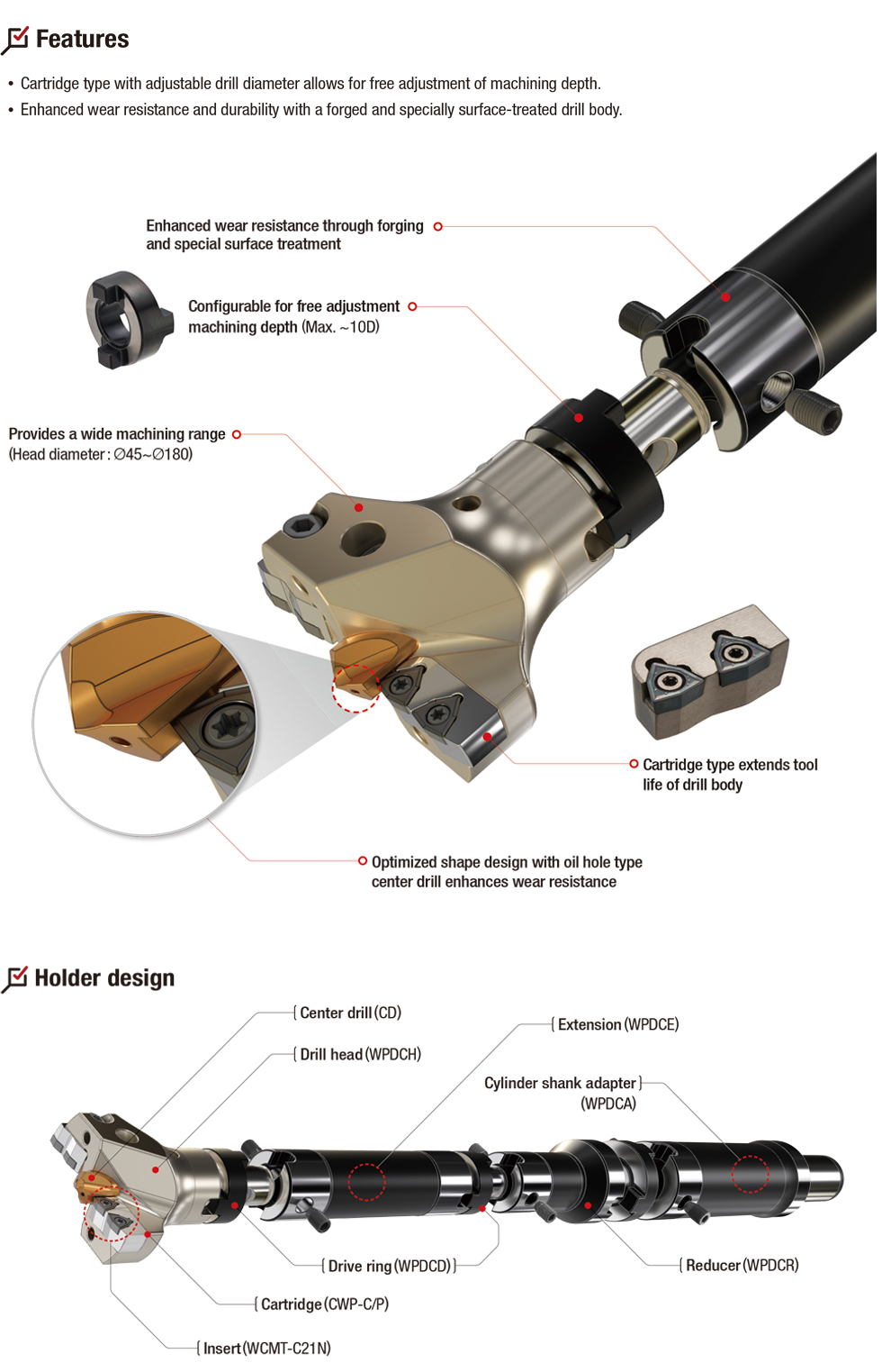 Based on high durability and flexibility, WPDCH improves machining performance and reduces maintenance costs. It offers a longer tool life than existing drills by extending replacement cycles and reduces the need for additional equipment, as it can machine various of diameters with a single body.