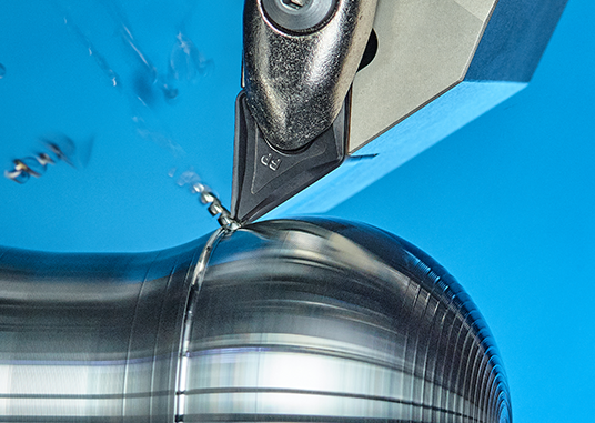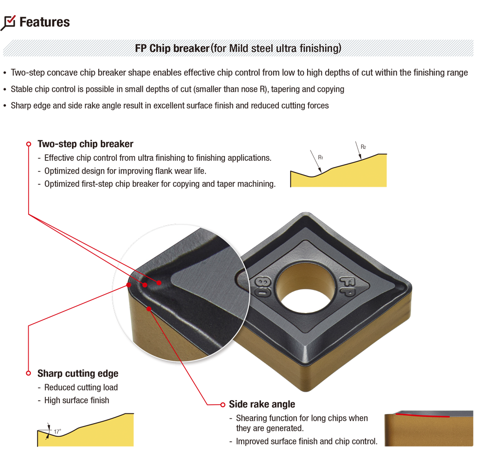 The FP chip breaker features a two-step chip breaker shape, enabling effective chip curling from ultra finishing (ap 0.3 mm) - finishing (ap 1 mm) applications. Its first-step chip breaker shape, optimized for copying and taper machining, provides stable chip control in finishing complex shapes.