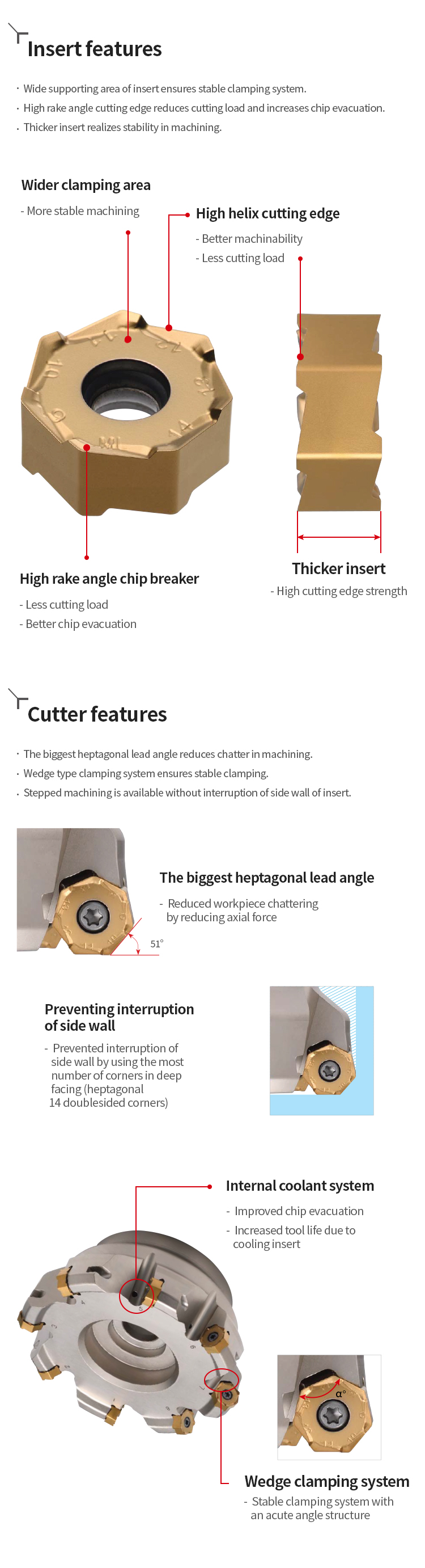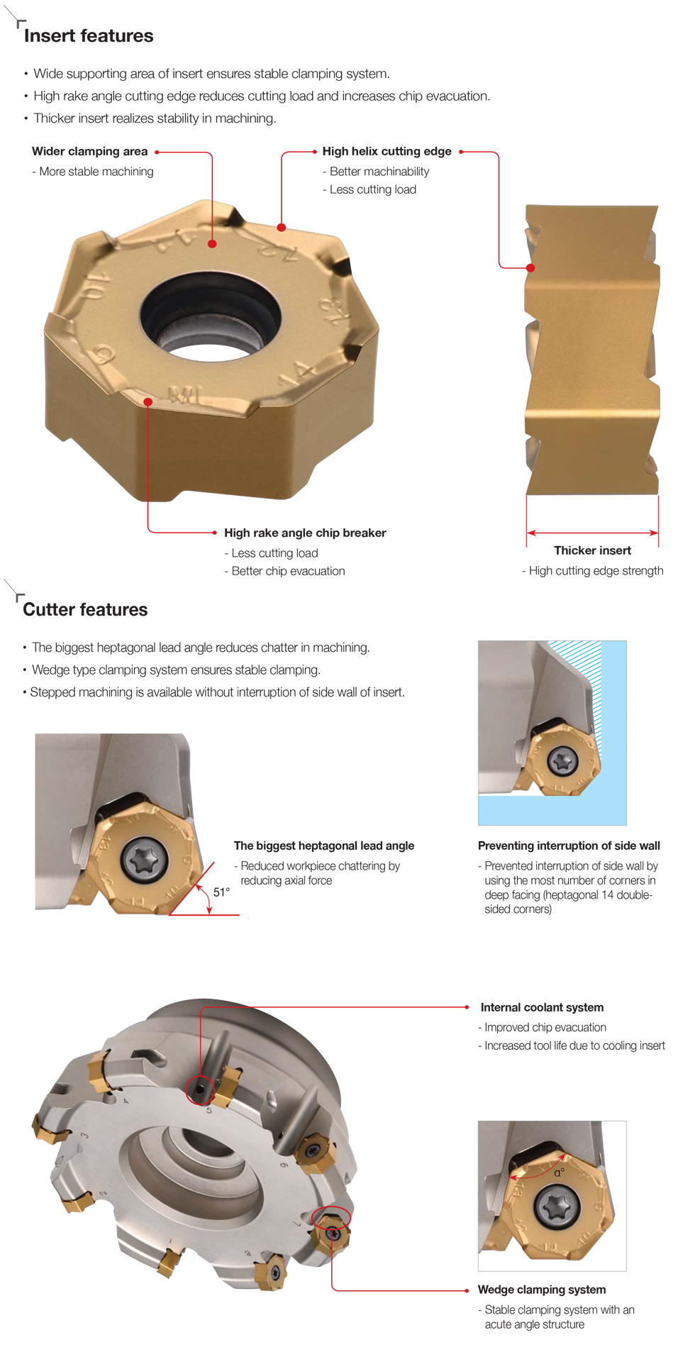 RM14 designed with the maximum lead angle, 51˚ of heptagonal shape reduces cutting load and chattering comparing to the conventional face mill with lead angle, 45˚. Its strong wedge type clamping system ensures stable tool life even in poor cutting conditions.