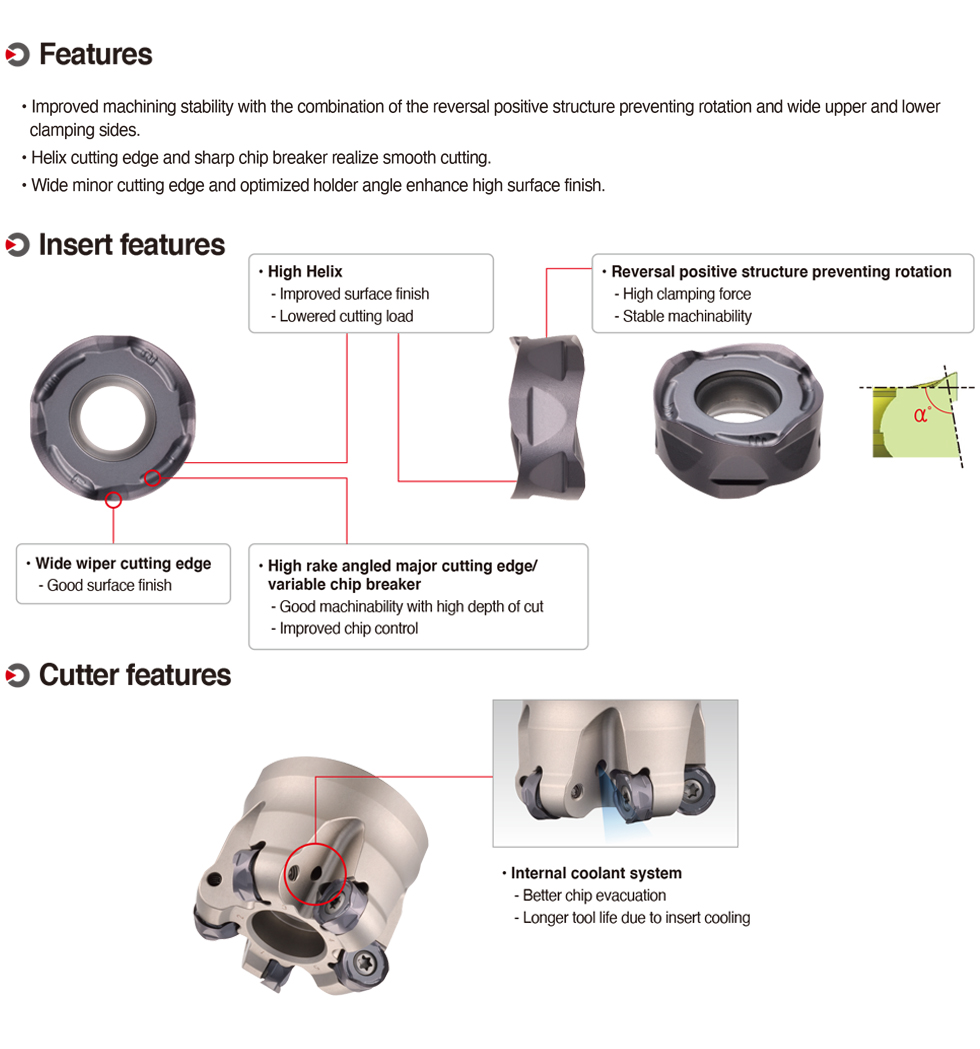 In addition, with its compact C/B and helix-shaped cutting edge, RMR exhibits excellent cutting performance even in high feed cutting operations. The optimized angle design between the minor cutting edge and workpiece provides superior surface finish.