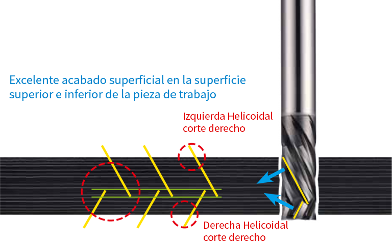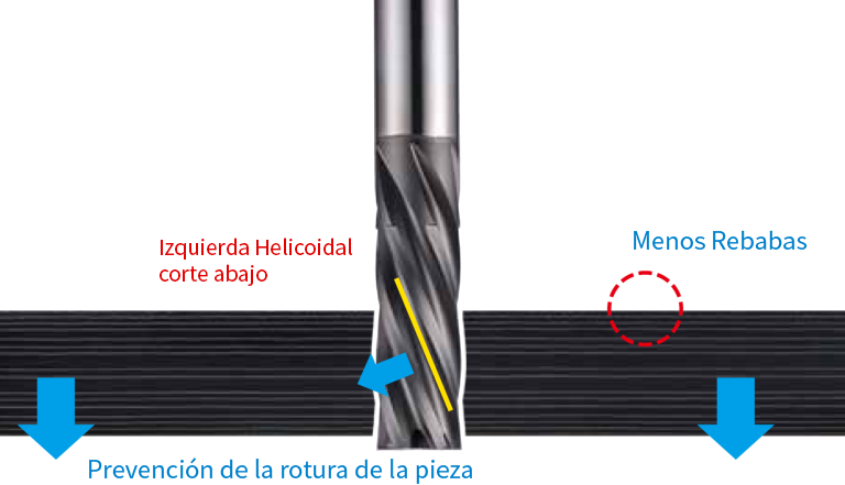 Fresa con múltiples filos (6F, 8F) para garantizar un mecanizado preciso y altamente eficiente. El ángulo inverso mejora la fuerza de fijación debido a que la fuerza de corte ocurre en dirección descendente.