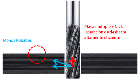 La implementación de múltiples filos y Nick garantiza una operación de desbaste altamente eficiente y resistencia en los filos de corte. La aplicación de un ángulo reducido ayuda a reducir las rebabas en la parte superior de la pieza de trabajo.