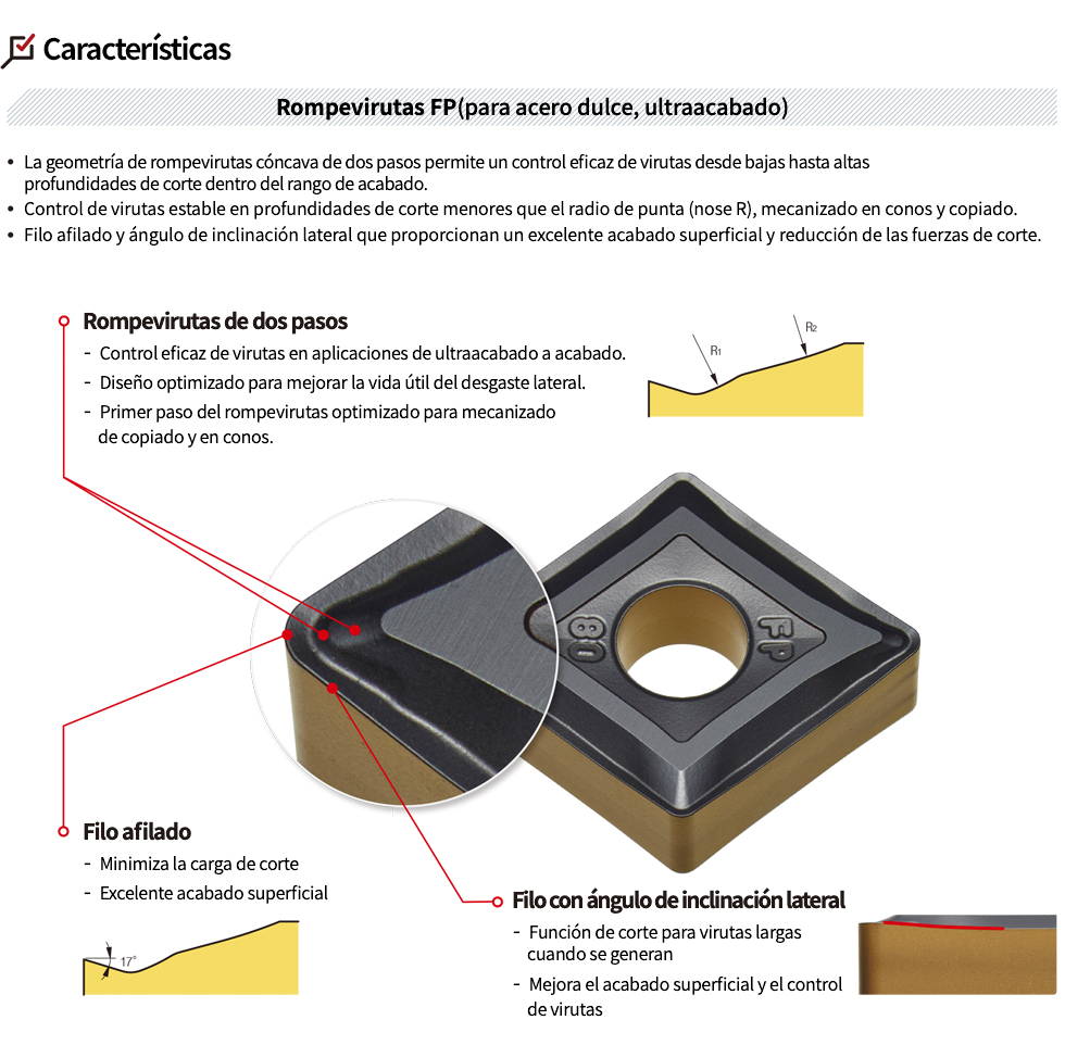 Gracias a su diseño optimizado para el torneado exterior de acabado y a su compatibilidad con diversos grados, el rompevirutas FP evita la obstrucción de virutas no solo en aceros dulces, sino también en aceros al carbono, aceros aleados y aceros para rodamientos, ofreciendo la mejor solución para los clientes que buscan alta precisión dimensional y un acabado superficial superior.