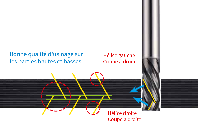 1. Minimise la force de coupe vers la direction axiale avec un faible angle d'hélice pour éviter la formation de bavures, mais maximise sa force de coupe vers sa direction de coupe. 2. La forme épaisse centrale améliore la résistance de l'outil et minimise les vibrations.