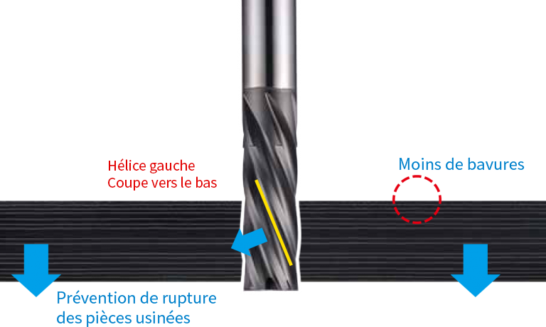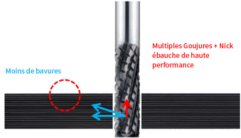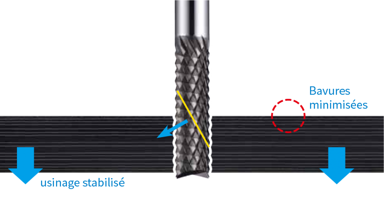 La conception des arêtes de coupe diamentées raccourcit la longueur des arêtes à l'endroit où la coupe est effectuée, ce qui réduit la charge de coupe et empêche les défauts d'usinage.
