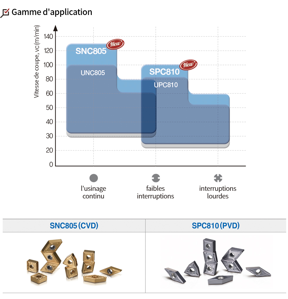 • SNC805 : Un usinage à plus grande vitesse peut être appliqué par rapport à l'UNC805, tout en ayant la même ténacité.