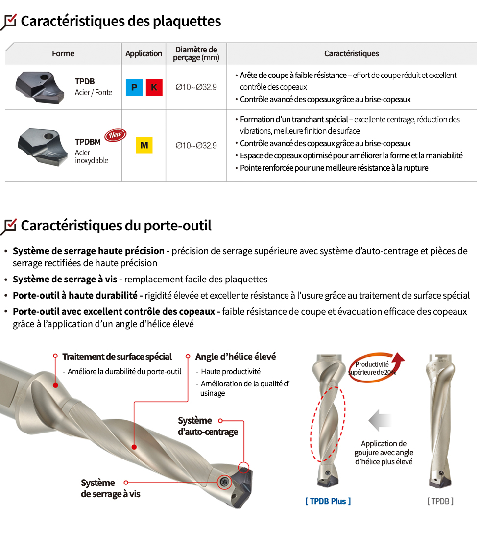 - Performances exceptionnelles en perçage grâce à des arêtes de coupe spécifiquement conçues selon l’application