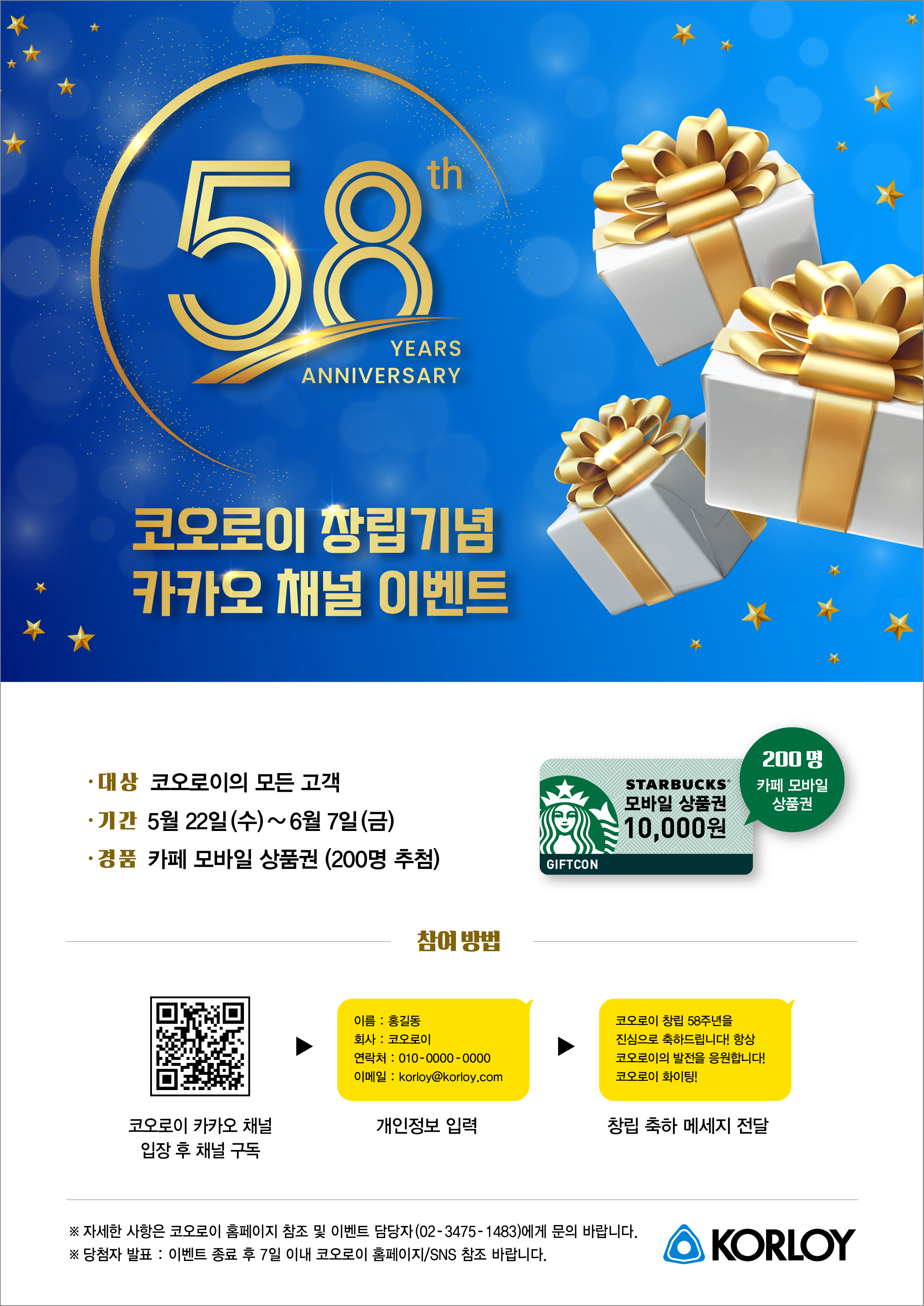 코오로이가 창립 58주년을 맞이하여 고객감사 카카오 채널 이벤트를 진행합니다!