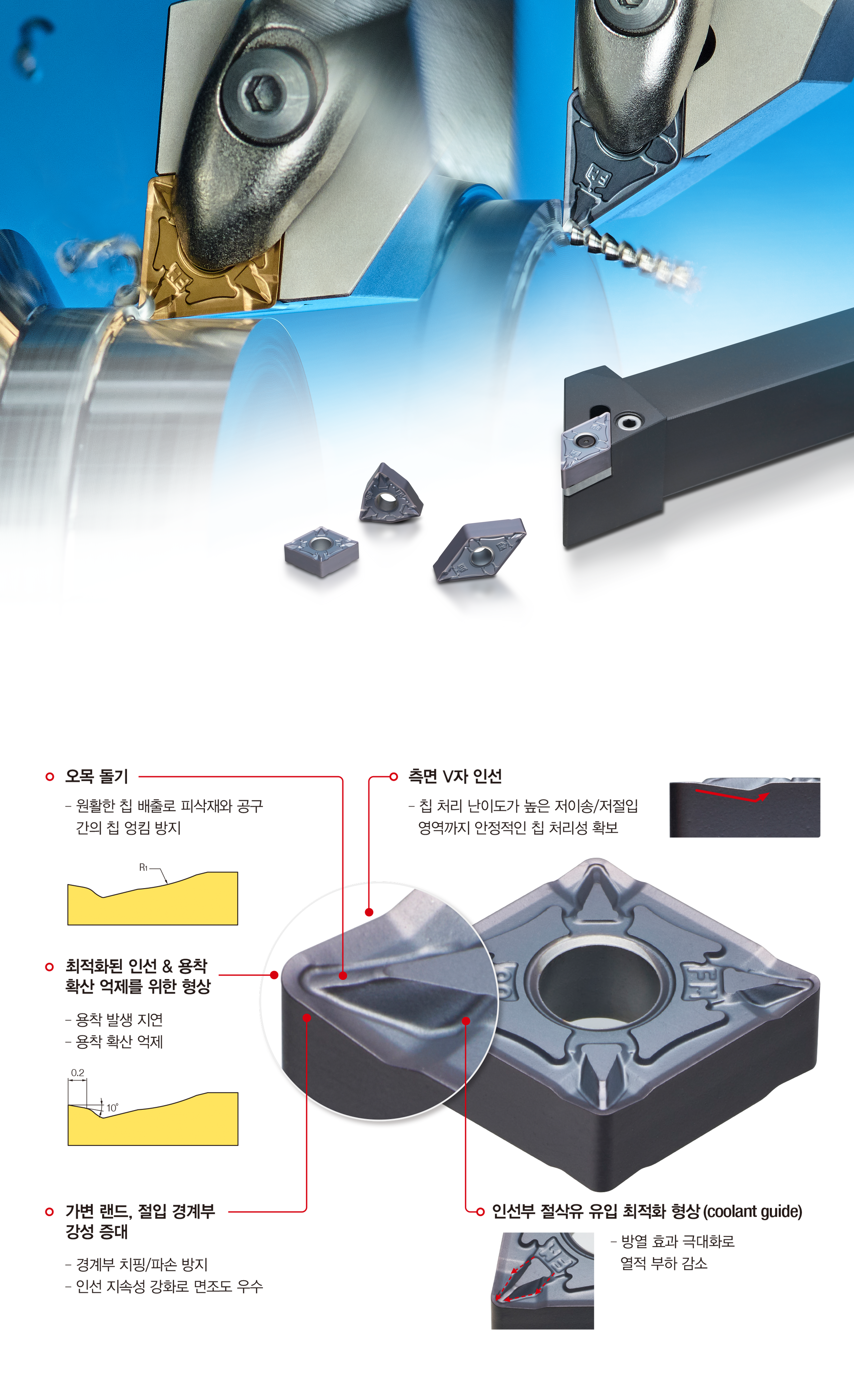 스테인리스강용 네가티브 터닝 인써트 (사상 영역 칩 처리 강화형) FM 칩브레이커를 새롭게 출시하였습니다.