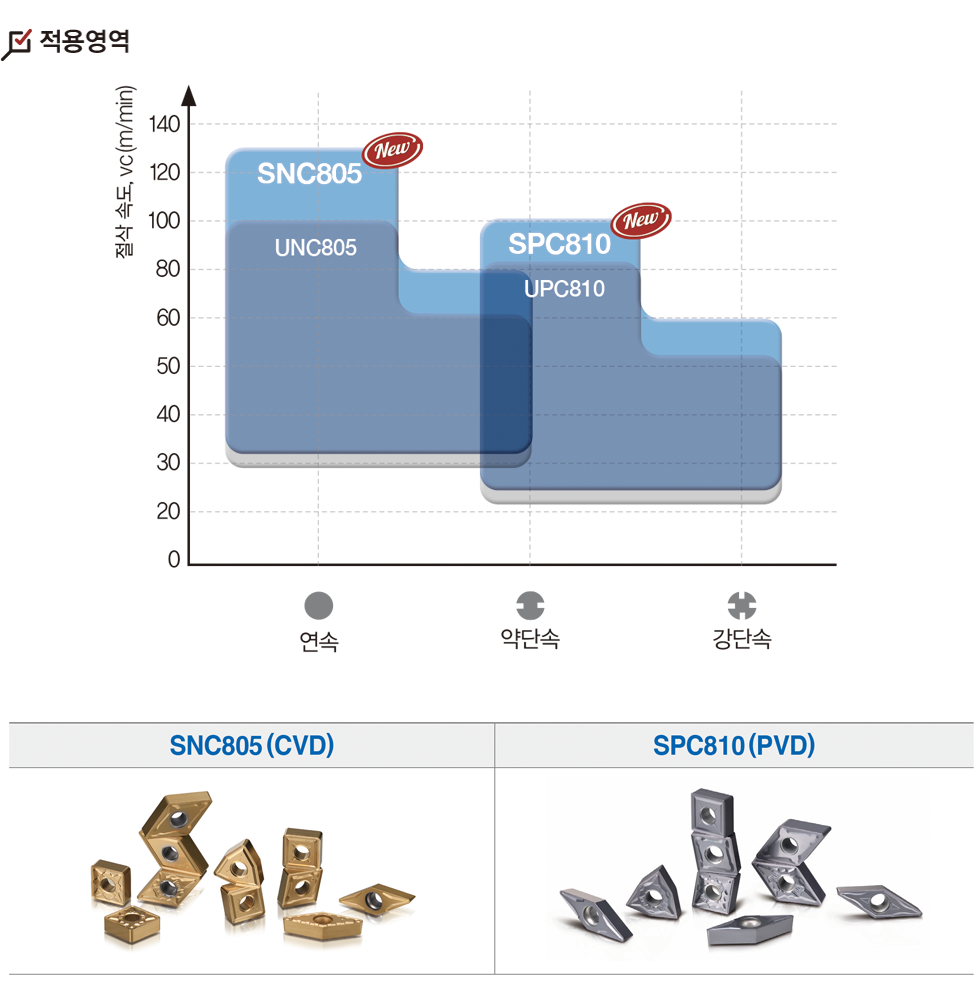 • SNC805 : 고속조건 및 내마모성 향상을 위해서 초미립 모재 및 CVD 코팅 적용