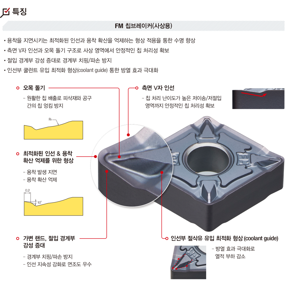 더불어, FM 칩브레이커는 스테인리스강을 포함한 난삭재 가공에서 취약한 절입 경계부에 가변 랜드 설계를 적용하여 강성을 확보함으로서, 치핑과 파손을 효과적으로 방지하고 안정적인 공구 수명과 뛰어난 면조도를 동시에 실현하는 최적의 솔루션입니다.