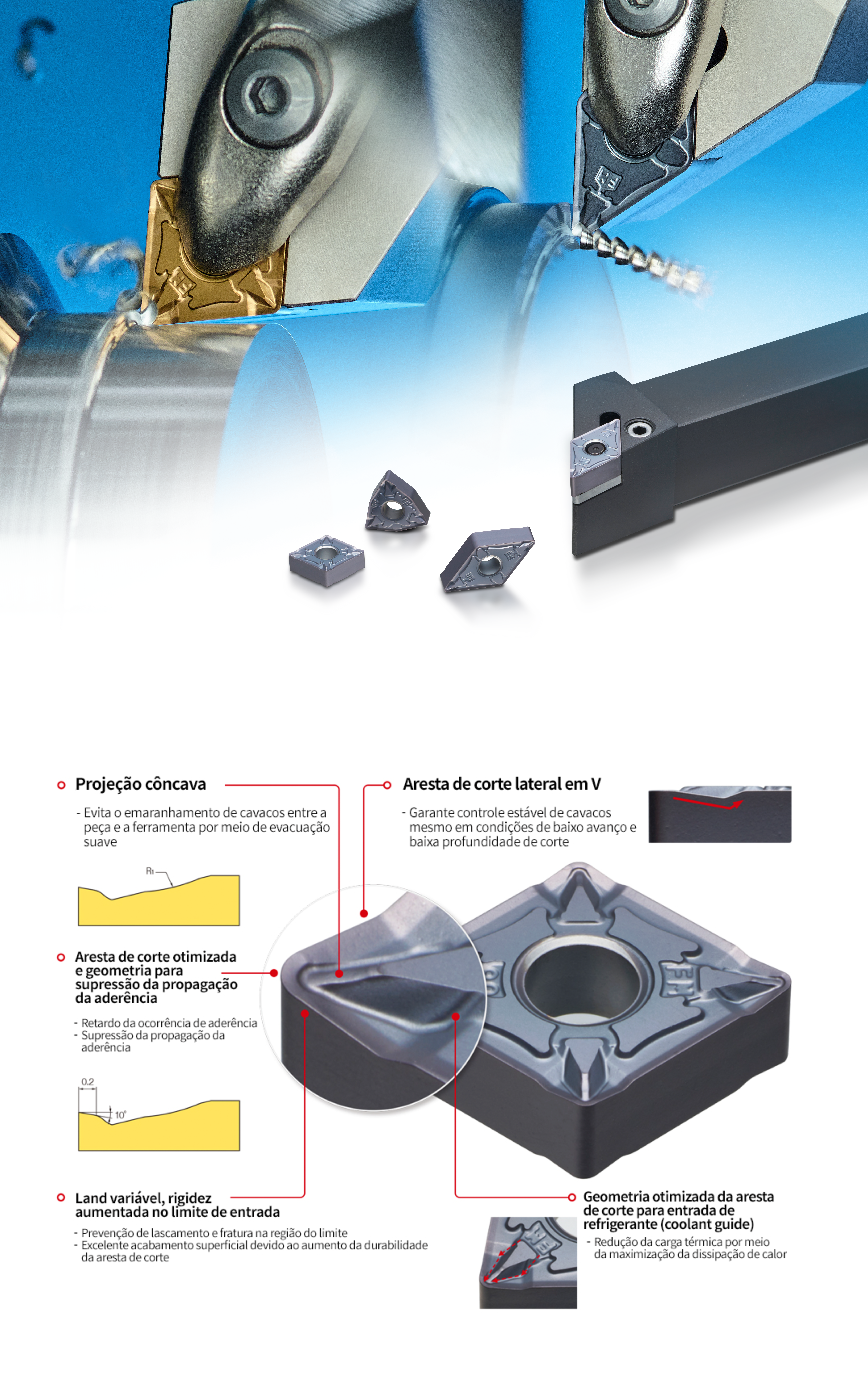 O quebra-cavacos FM maximiza o controle de cavacos em condições de baixa profundidade de corte e baixo avanço por meio de uma aresta de corte lateral em V e projeção côncava. Além disso, a geometria de supressão de aderência na base melhora significativamente a vida útil da ferramenta na usinagem de aço inoxidável. A elevada qualidade de fabricação garante também alta precisão dimensional e excelente acabamento superficial.