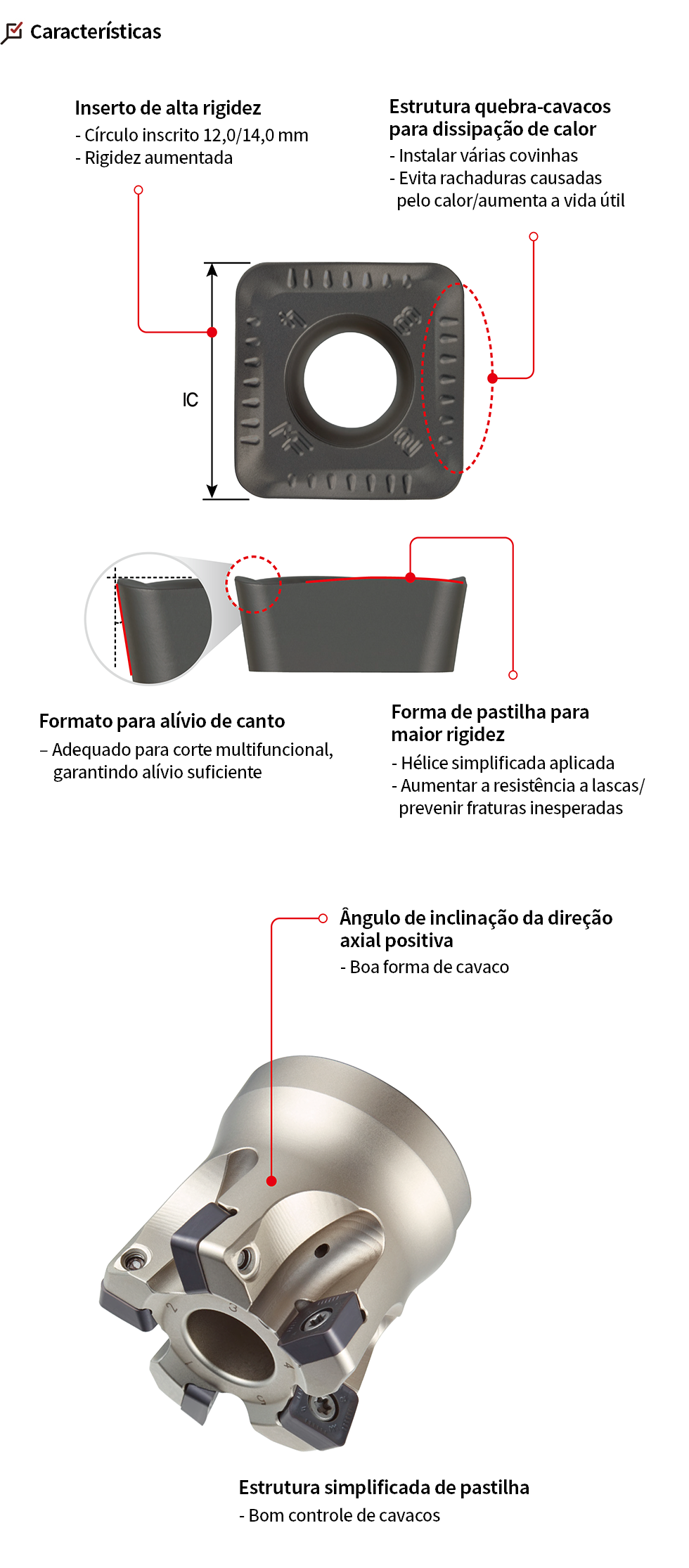 • Corte de alta velocidade e alto avanço com ângulo de inclinação ideal e aresta de corte de hélice alta