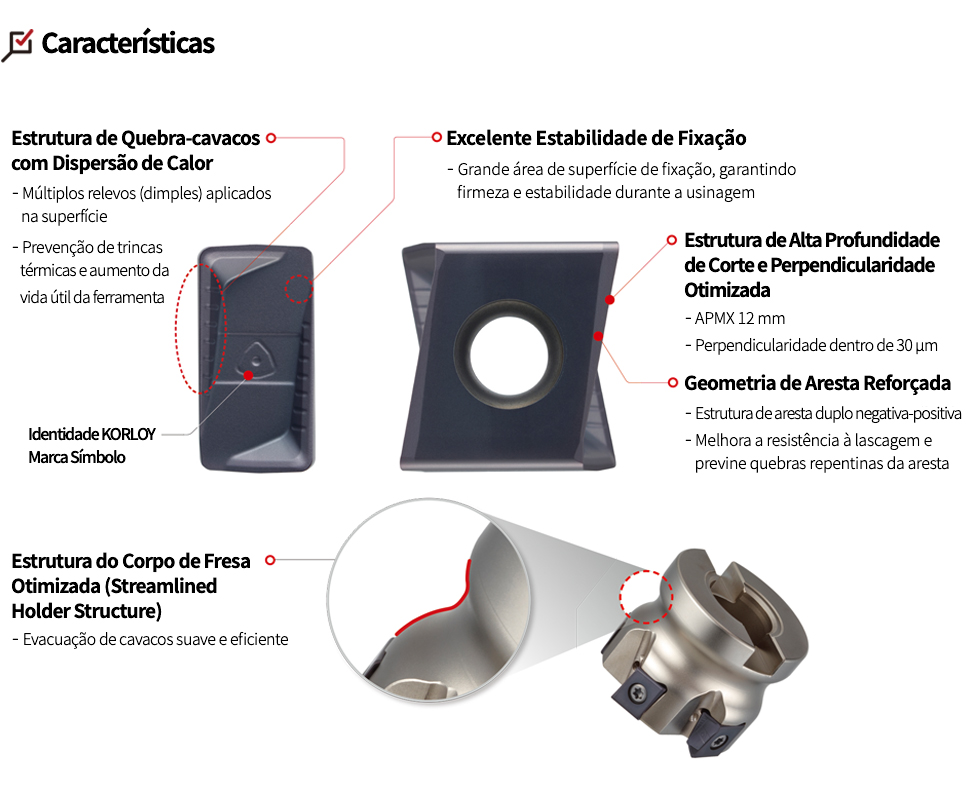 • Maior produtividade graças à forte força de fixação do tipo tangencial e à aplicação com múltiplas pastilhas.