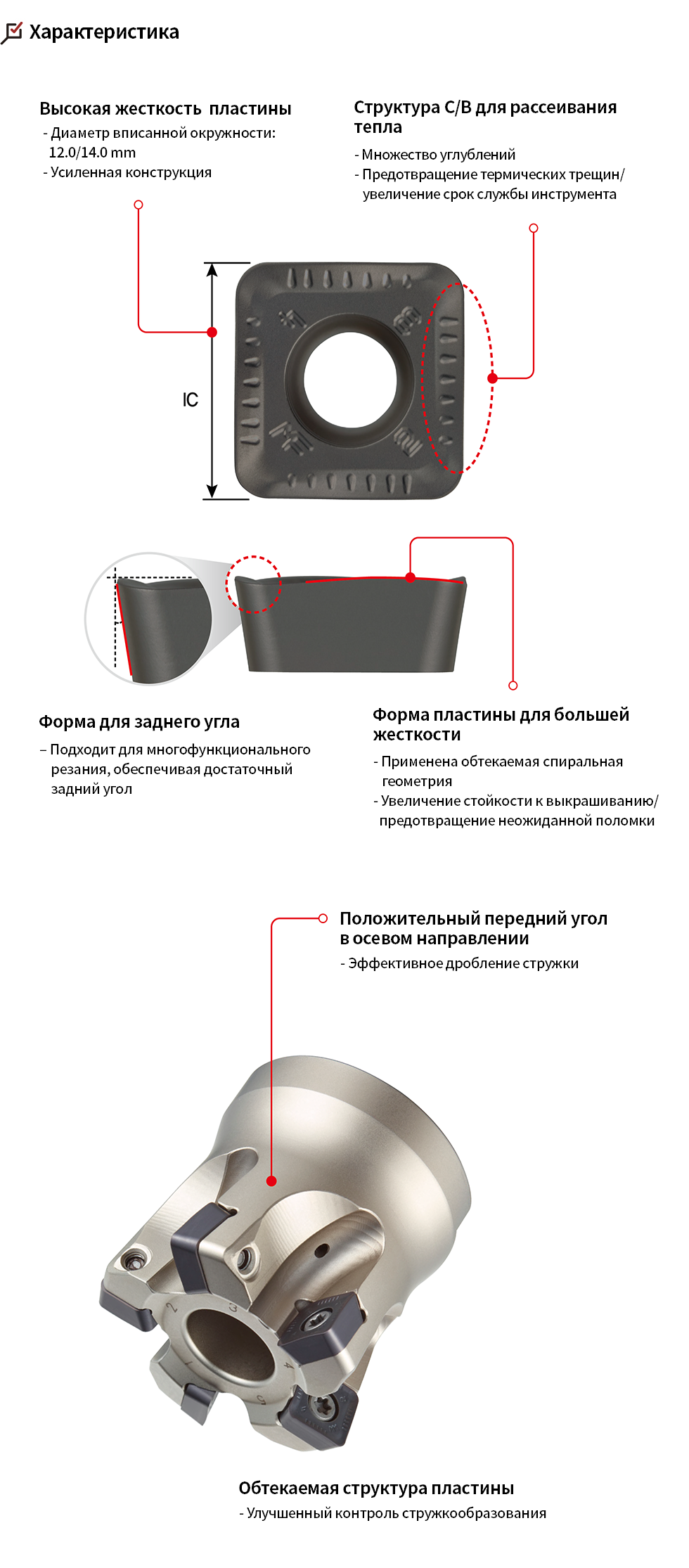 • Высокая скорость резания и высокая подача благодаря оптимальному переднему углу и режущей кромке с большим углом наклона