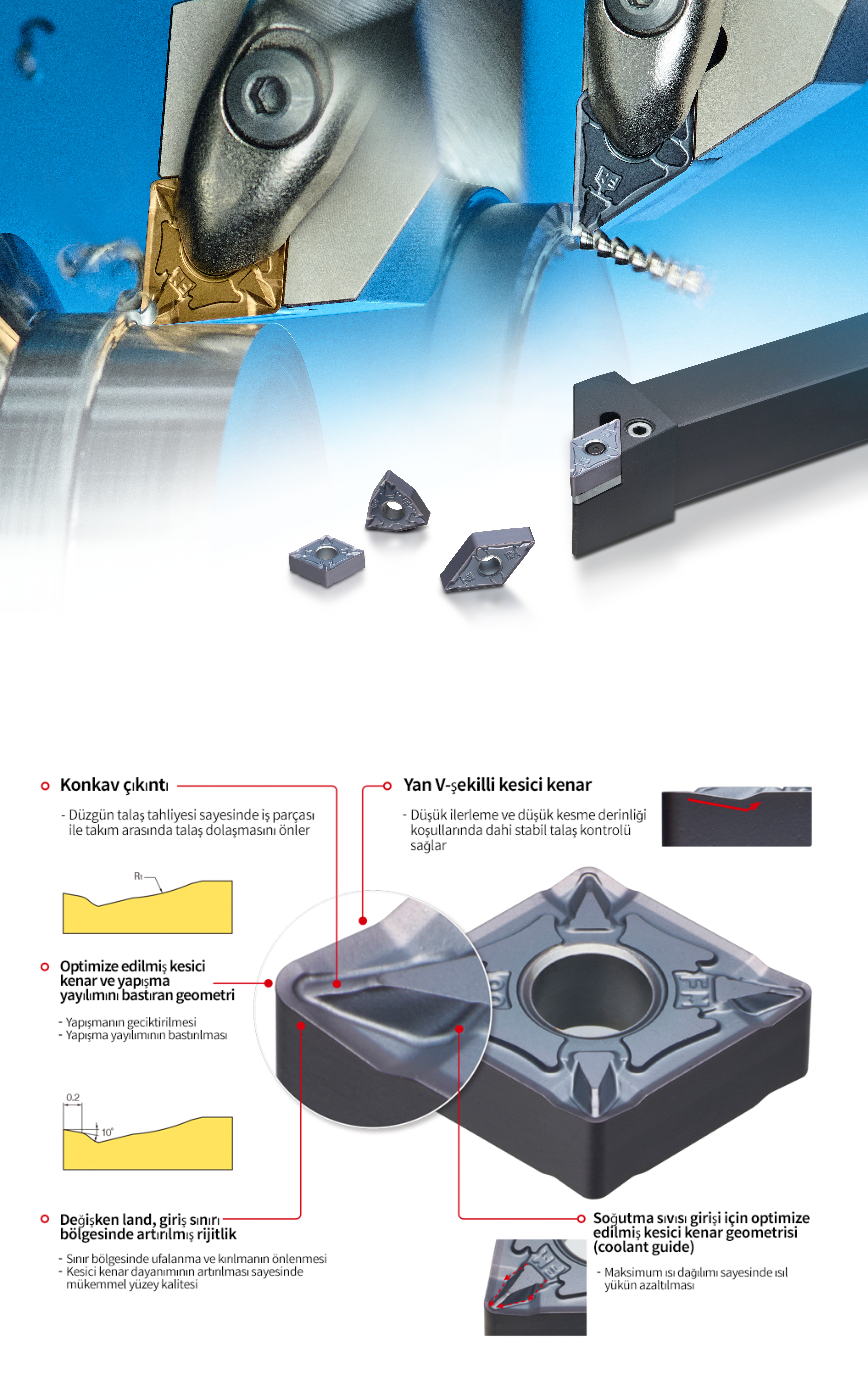FM talaş kırıcı, yan V-şekilli kesici kenar ve konkav çıkıntı tasarımı sayesinde düşük ilerleme ve düşük kesme derinliği koşullarında talaş kontrolünü en üst seviyeye çıkarır. Ayrıca taban kısmındaki yapışma bastırıcı geometri, paslanmaz çelik işleme sırasında takım ömrünü önemli ölçüde artırır. Yüksek üretim kalitesi, üstün boyutsal hassasiyet de sağlar.